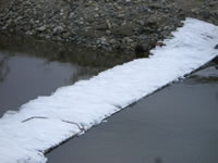 従来から、オイルフェンスの展張で油の拡散を止め、フェンス上流の水面で吸着マットを使用して回収する方法が採用 されています。当会では、人工河川を使用した油吸着実験のデータから、毎秒3mの流速でも、従来型吸着マットでは著